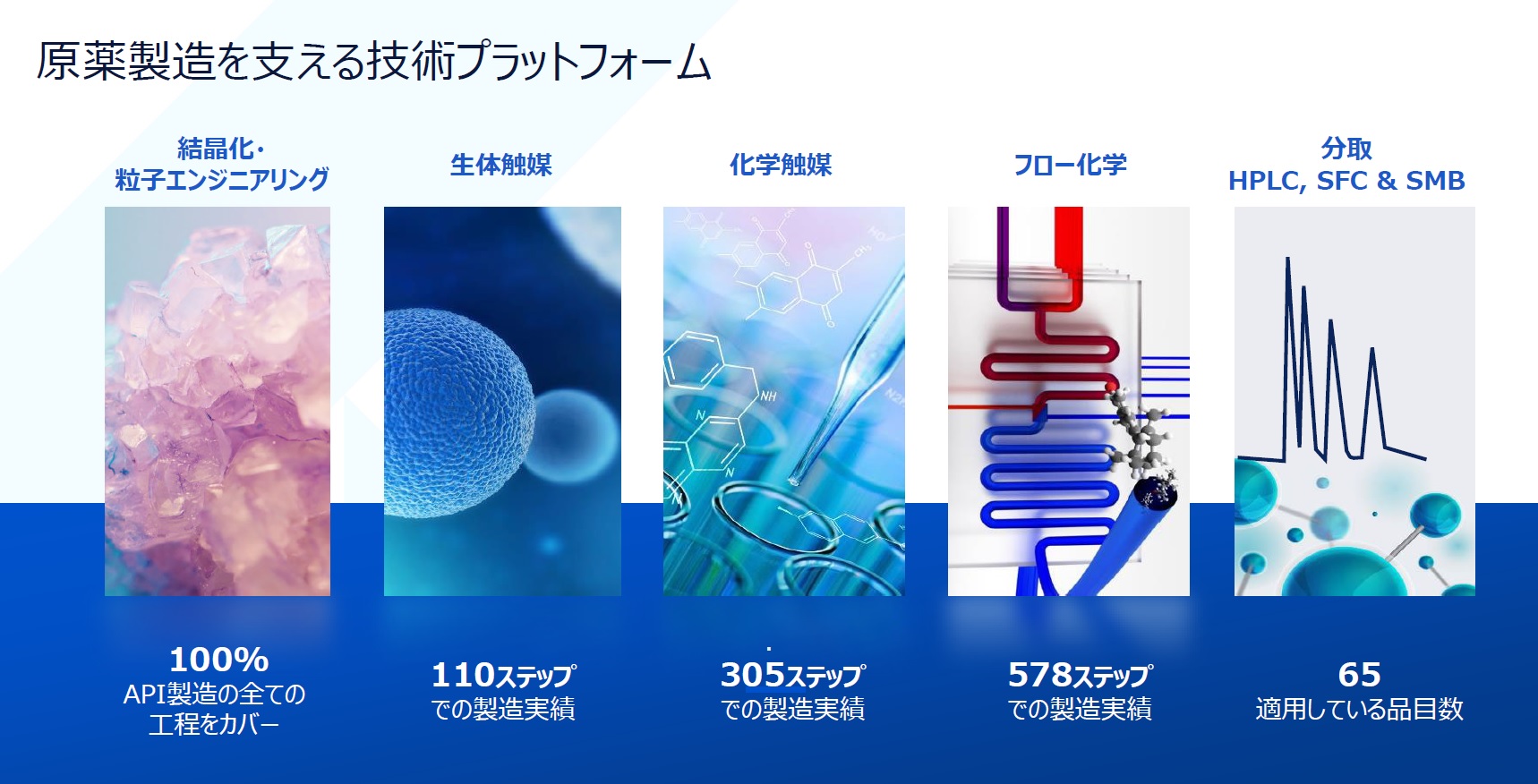 5つの技術分野で専門のチームが製造プロセス開発をサポートします(フローケミストリー、生体触媒反応、化学触媒反応、結晶化・塩検討、分離・精製)。
